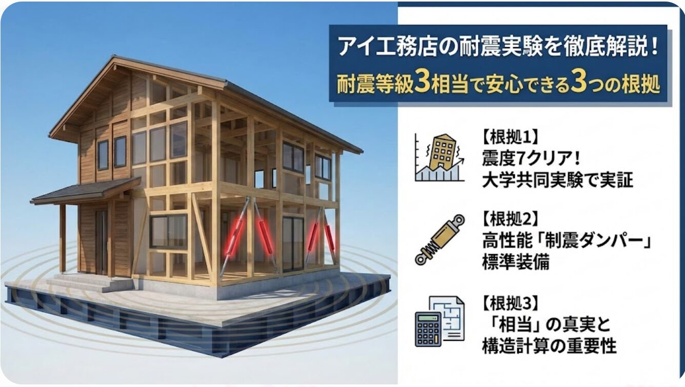アイ工務店は、大学との共同耐震実験で高い安全性を客観的に証明しています。 標準仕様の「耐震等級3相当」でも十分な性能を持ちますが、公的な認定とは異なる点を理解することが大切です。