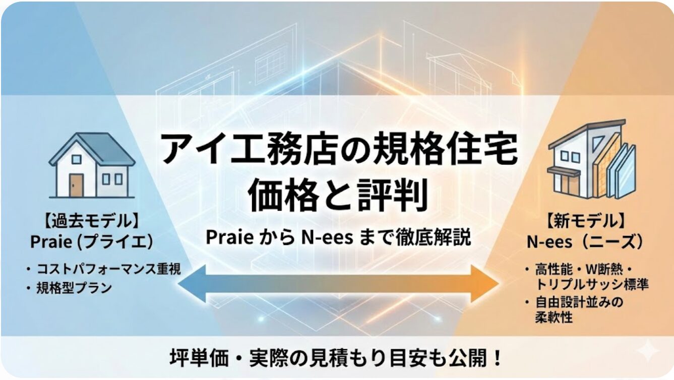 さらに、現在の主力商品であるN-eesの標準仕様や気になるN-eesの価格、実際のアイ工務店の坪単価についても、具体的な見積もりを公開しながら詳しく解説します。あなたの家づくりに関する疑問を、この記事で解決しましょう。