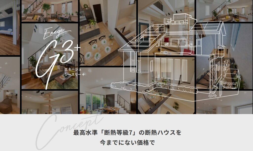 特に「エネージュG3+」は、UA値0.22という最高レベルの断熱性能を誇ります。屋上庭園の提案や、エアコン1台で家全体の空調を管理する「YUCACOシステム」など、独自の技術と工夫で、高性能かつ遊び心のある住まいを提案しています。