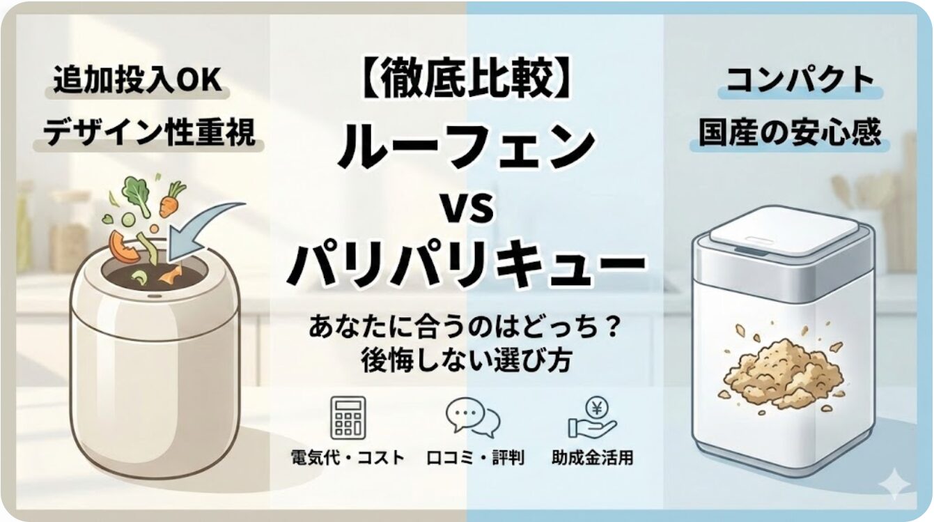 生ゴミの臭いやコバエ問題を手軽に解決できると話題の生ゴミ乾燥機。中でも人気の「ルーフェン」と「パリパリキュー」で迷っていませんか?