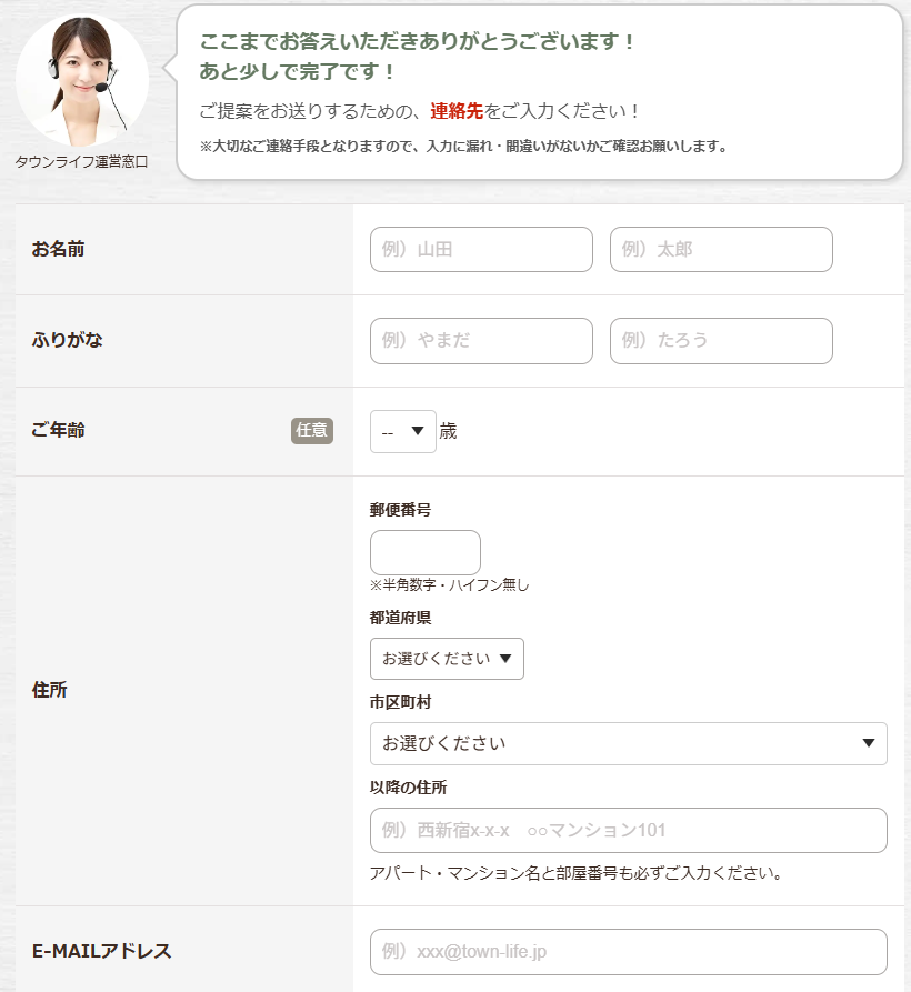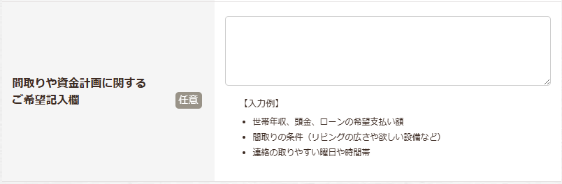希望・要望を記入する欄では、より具体的な条件を伝えることができます。具体的な希望を詳しく書くほど、あなたの理想に近い提案が期待できます。